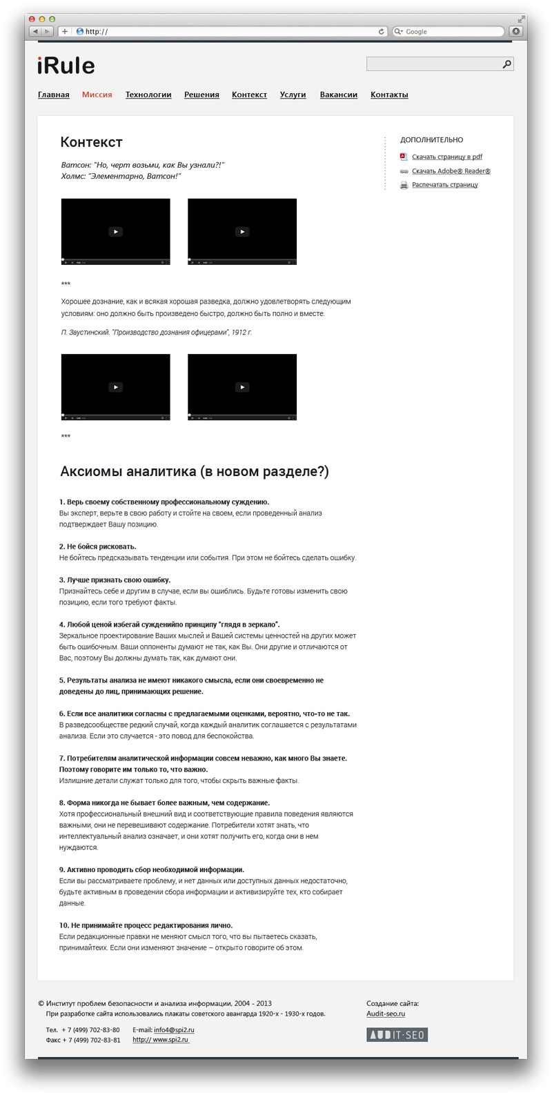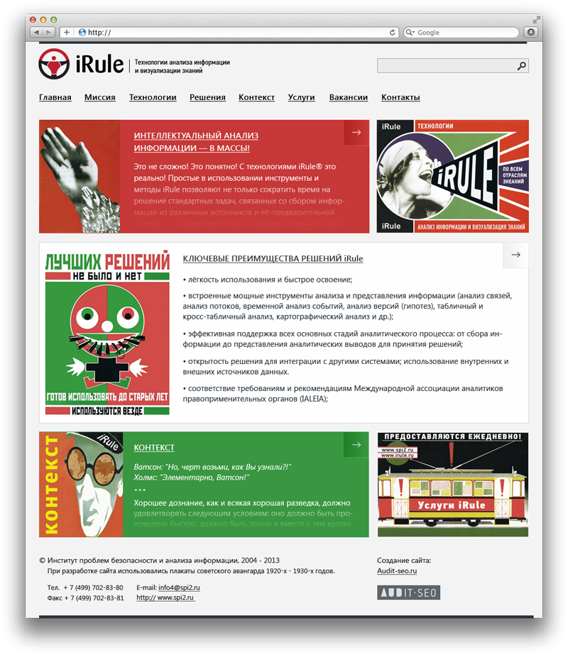 Пожалуй один из самых необычных и интересных проектов прошедшего года. Задача была в том чтобы создать сайт используя рисунки старых плакатов, по возможности ничего в них существенно не меняя, но при этом все композиции должна смотреться гармонично.